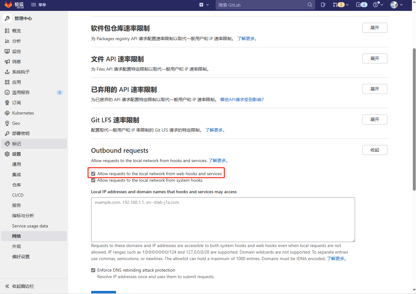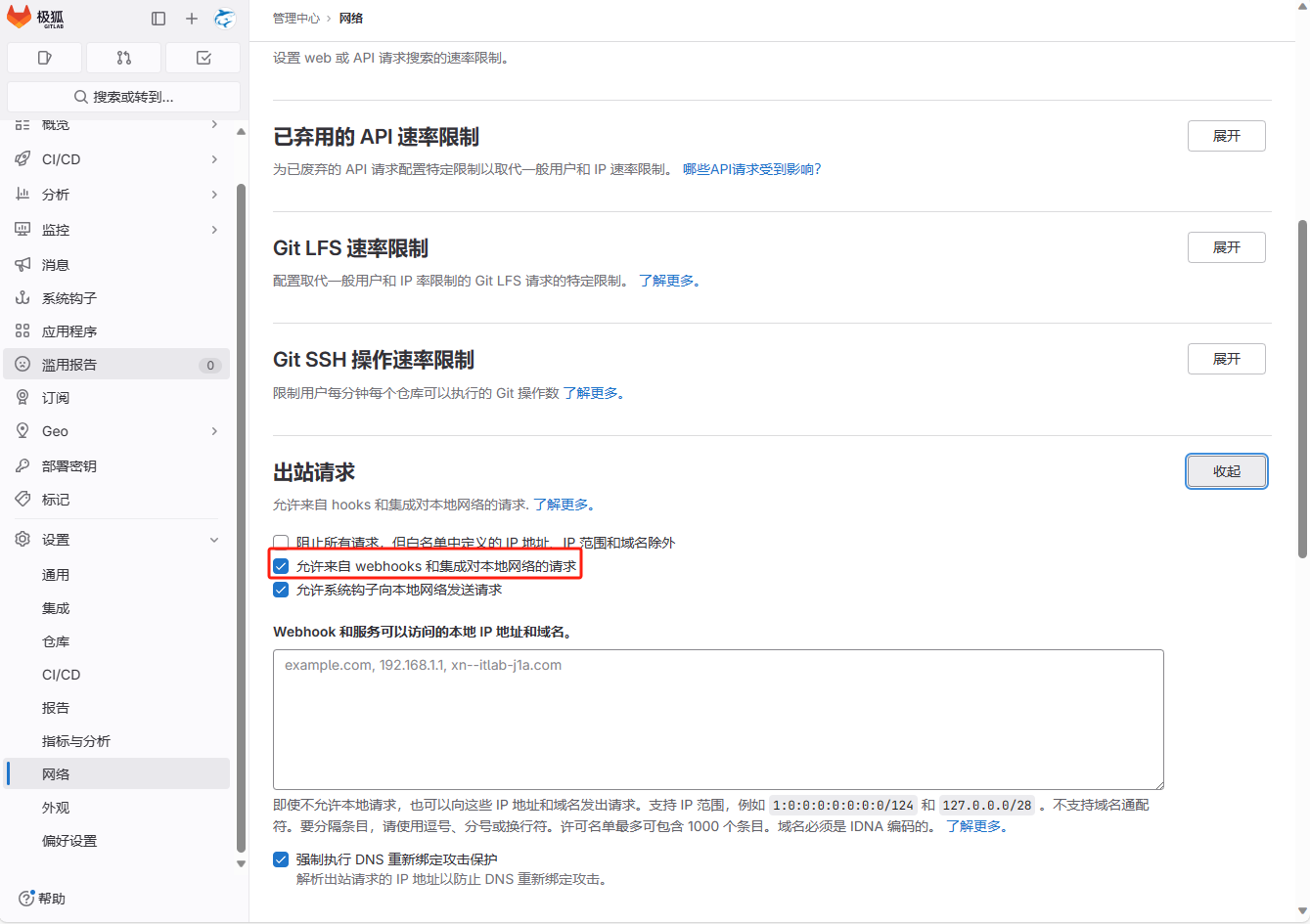 可以gitlab中找到设置-网络-外部请求,勾选允许webhook和服务对本地网络的请求。