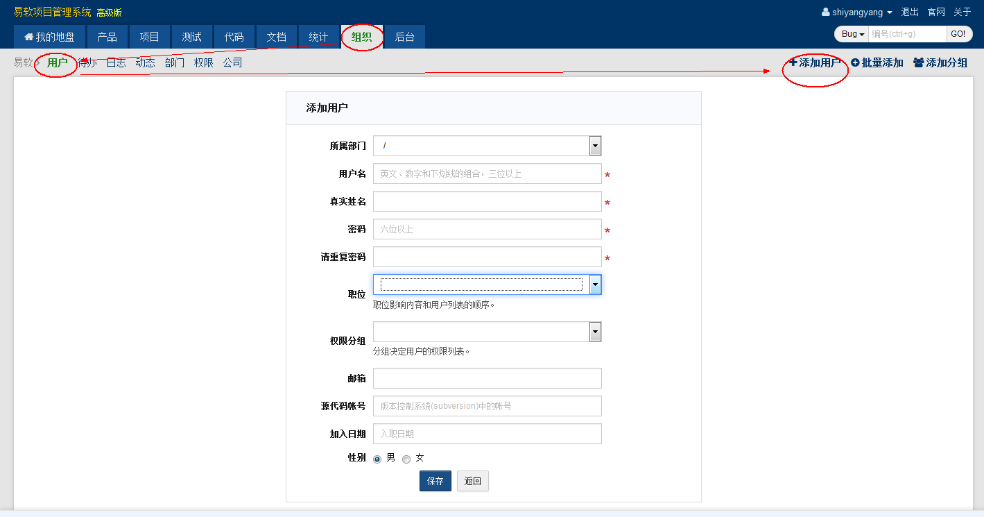 部门创建之后,下一步的操作就是往系统中添加用户。步骤如下: