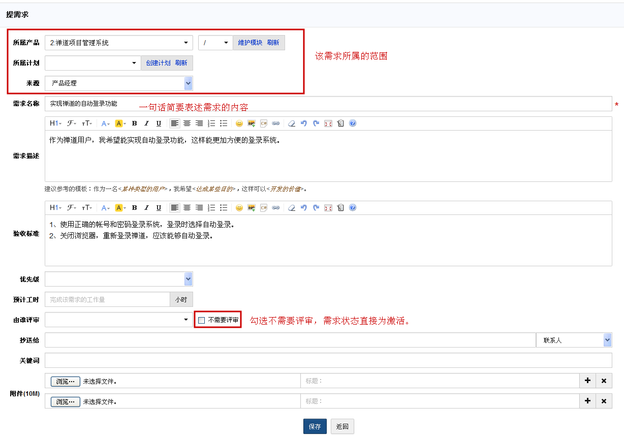 我们产品经理可能都习惯了写需求设计文档,或者规格说明书,通过一个非常完整的word文档将某一个产品的需求都定义出来。但在禅道里面,我们提倡 按照功能点的方式来写需求。简单来讲,就是将原来需求设计文档中的每一个功能点摘出来,录在禅道里面,作为一个个独立的功能点。如果按照scrum标准走 的话,我们可以称之为用户故事(user story)。所谓用户故事,就是来描述一件事情,作为什么用户,希望如何,这样做的目的或者价值何在,这样有用户角色,有行为,也有目的和价值所在,非常方便与团队成员进行沟通。