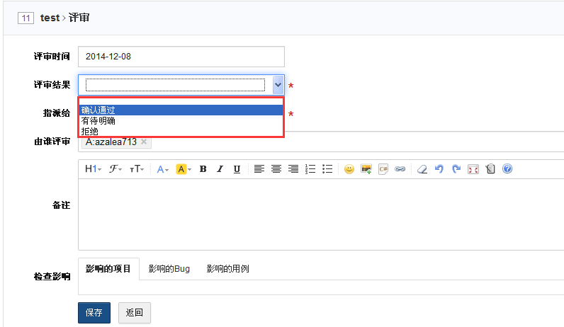 - 由谁评审是记录的参与评审的人员名单,可以输入用户名来自动筛选。一般来讲需求评审可以是一个线下的评审会议,在禅道里面记录下参与需求评审的人员即可。