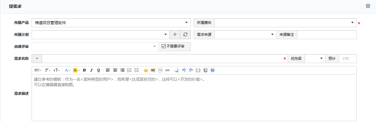 - 在页面右侧,有“提需求”菜单,点击菜单,出现新增需求的页面。