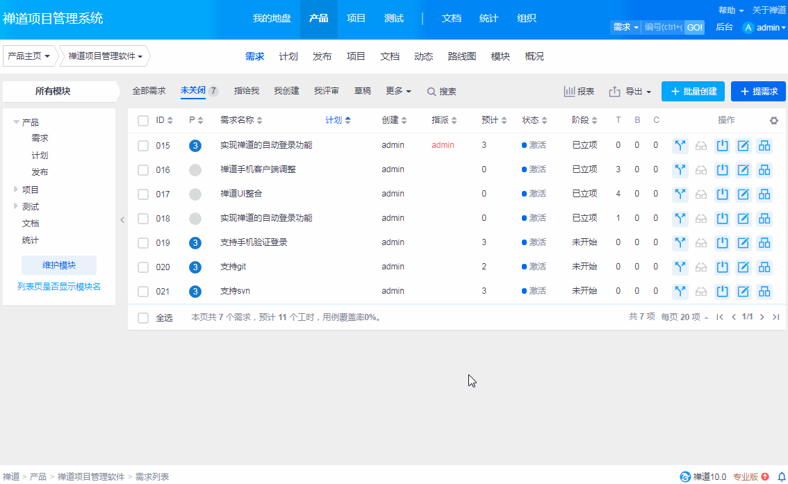 需求审核那块,我们选上不需要审核,这样新创建的需求状态就是激活的。只有激活状态的需求才能关联到项目中,进行开发。