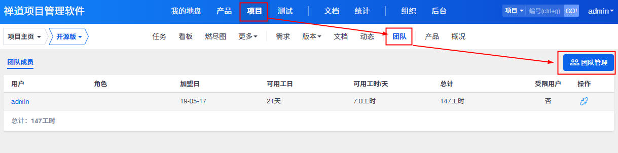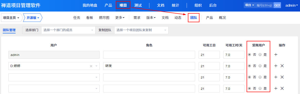 禅道9.5.1版本开始,在团队管理里新增了受限用户的功能,比较适用于对项目里新员工的权限设置。