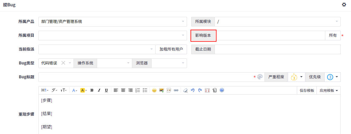 - 影响版本是必填的。而这里面的列表来源,则是项目中的版本。如果这个地方没有版本可选的话,则需要到与该产品关联的项目--版本中创建版本。