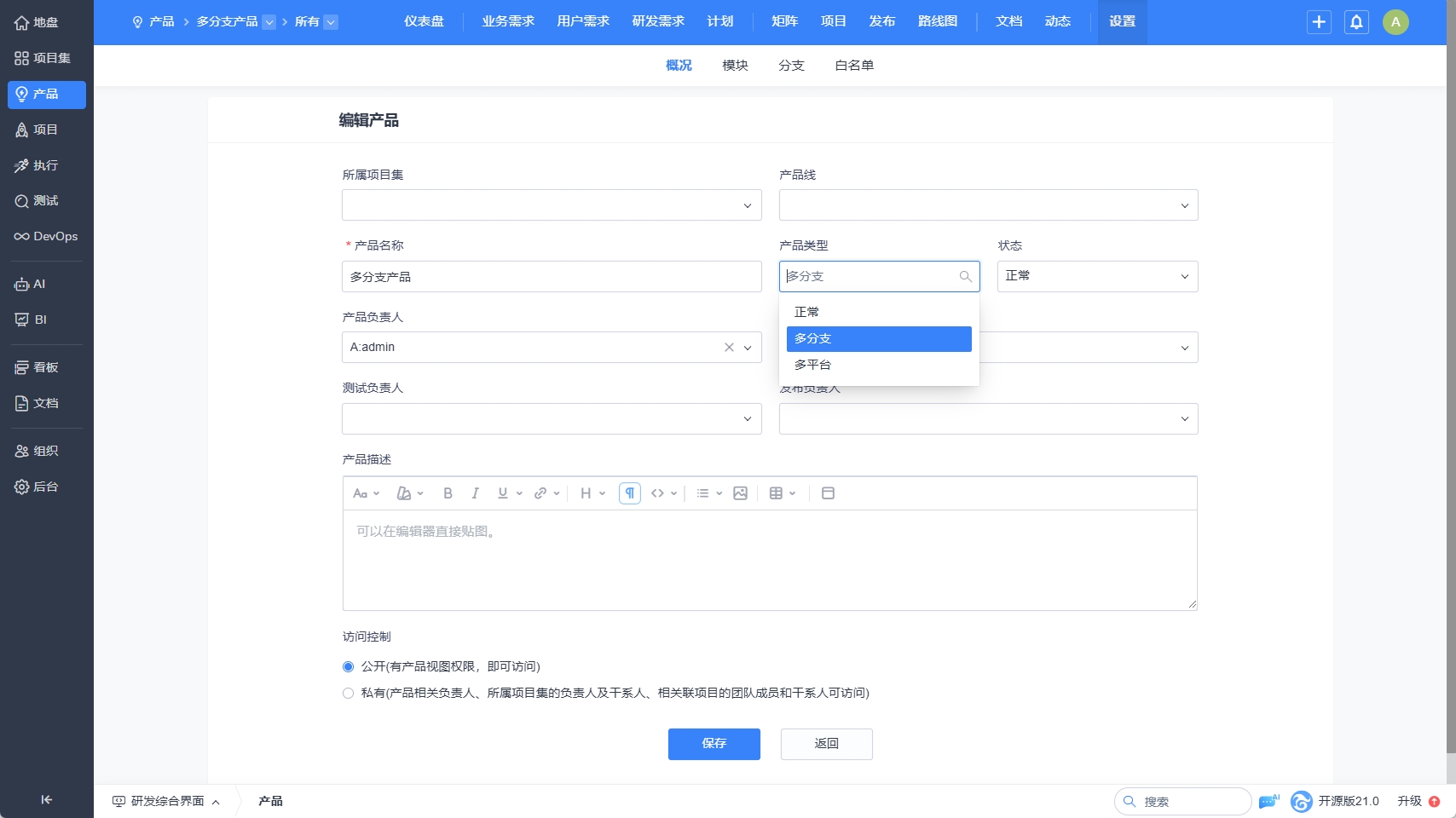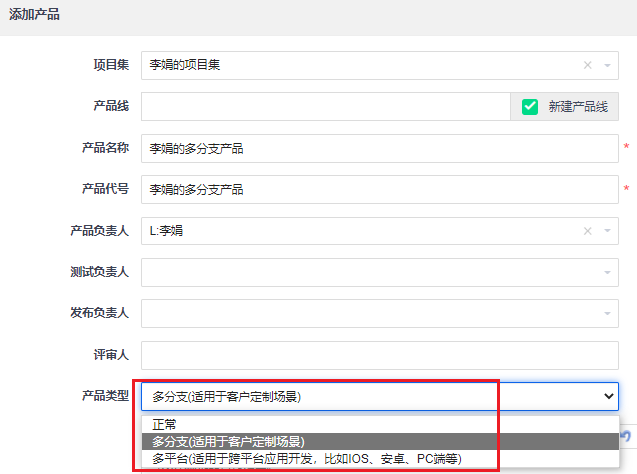 添加产品时,产品类型选择多分支或多平台。