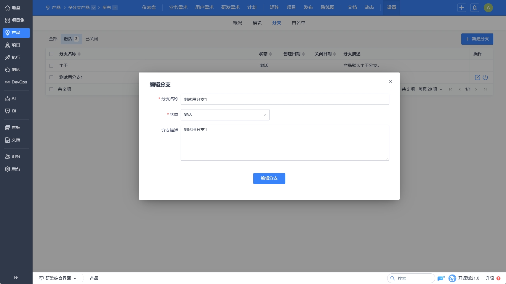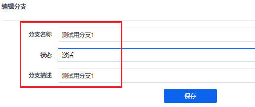 编辑分支时,可以修改分支名称、分支状态、分支描述。
