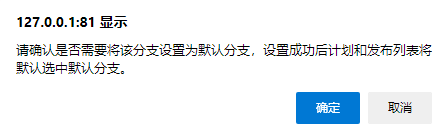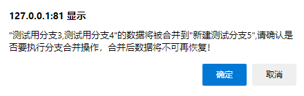 点击保存后,会提示进行确认,合并分支后,数据将不可以恢复,需要谨慎操作。