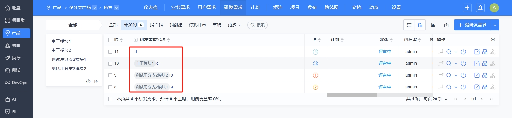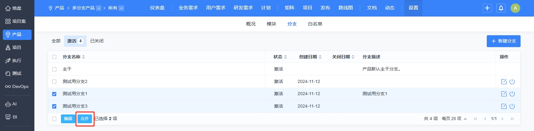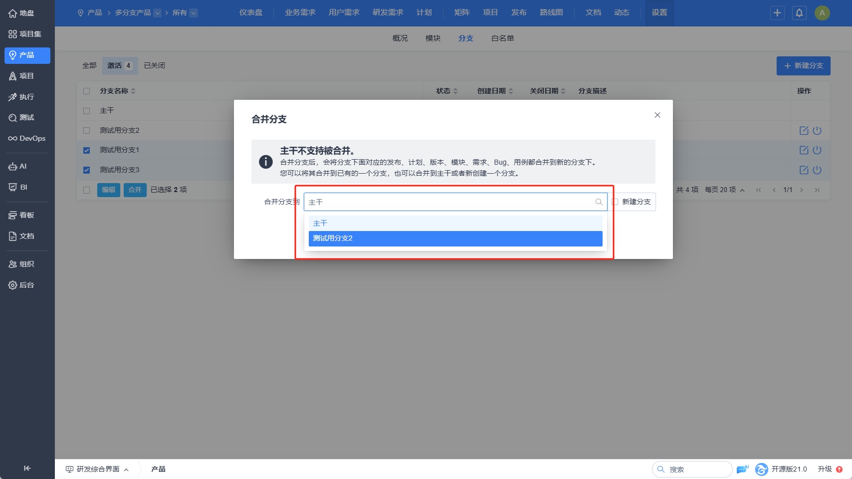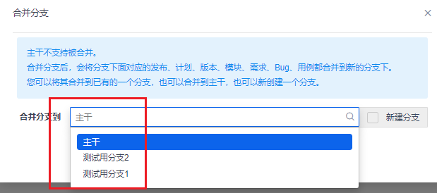 合并分支后,将会把分支下面对应的发布、计划、版本、模块、需求、Bug、用例都合并到新的分支下。