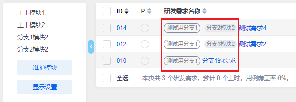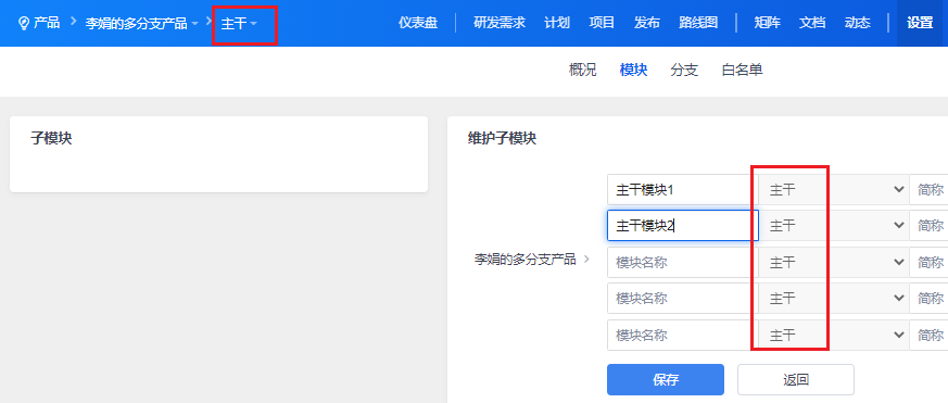产品--设置--模块里,创建和维护当前分支下的模块。