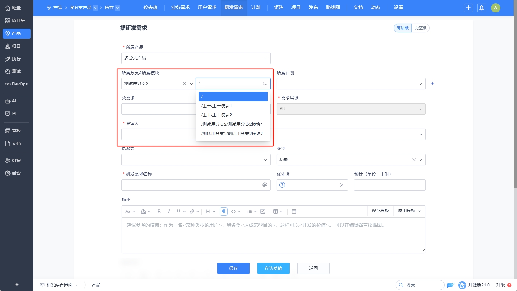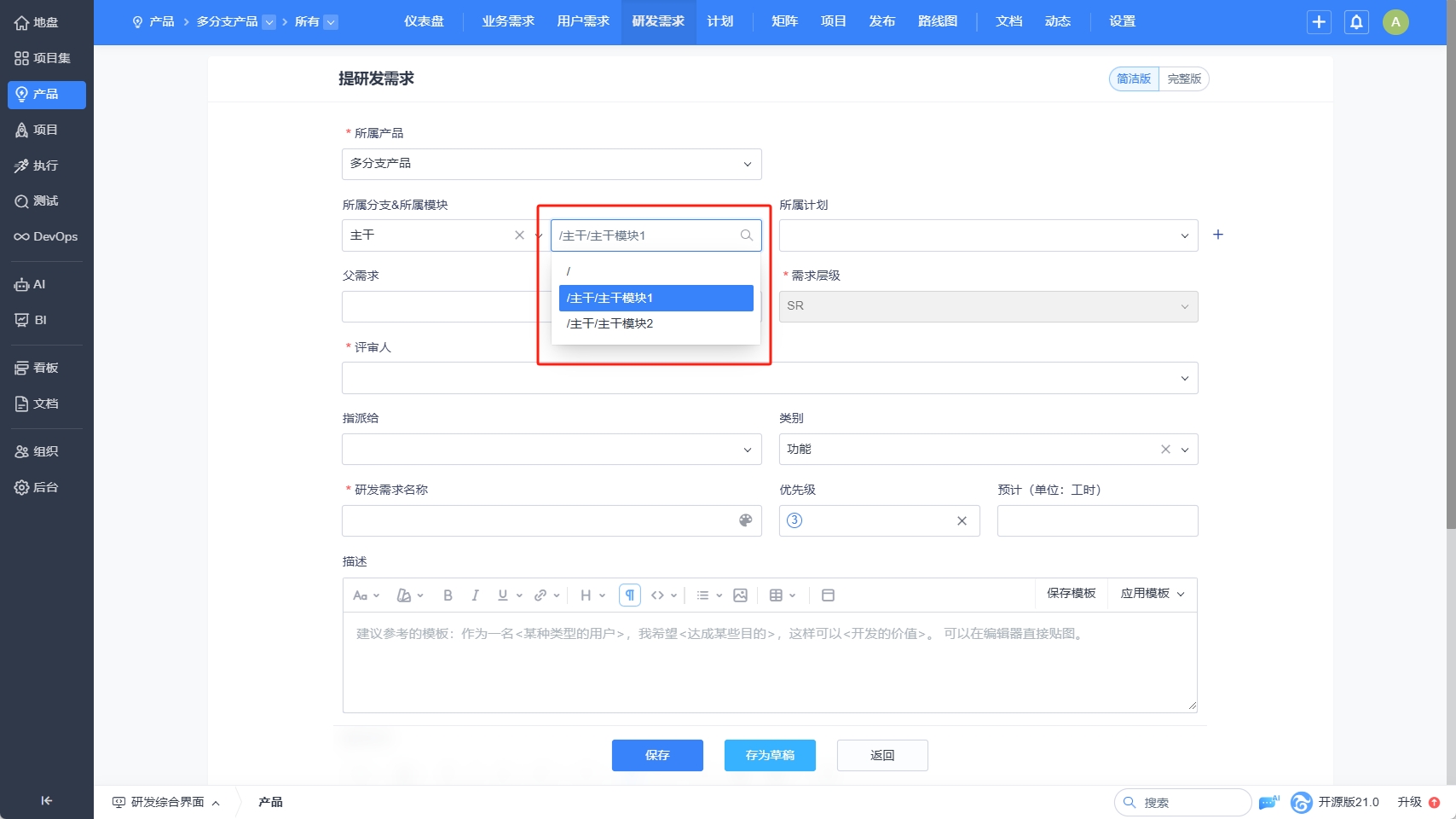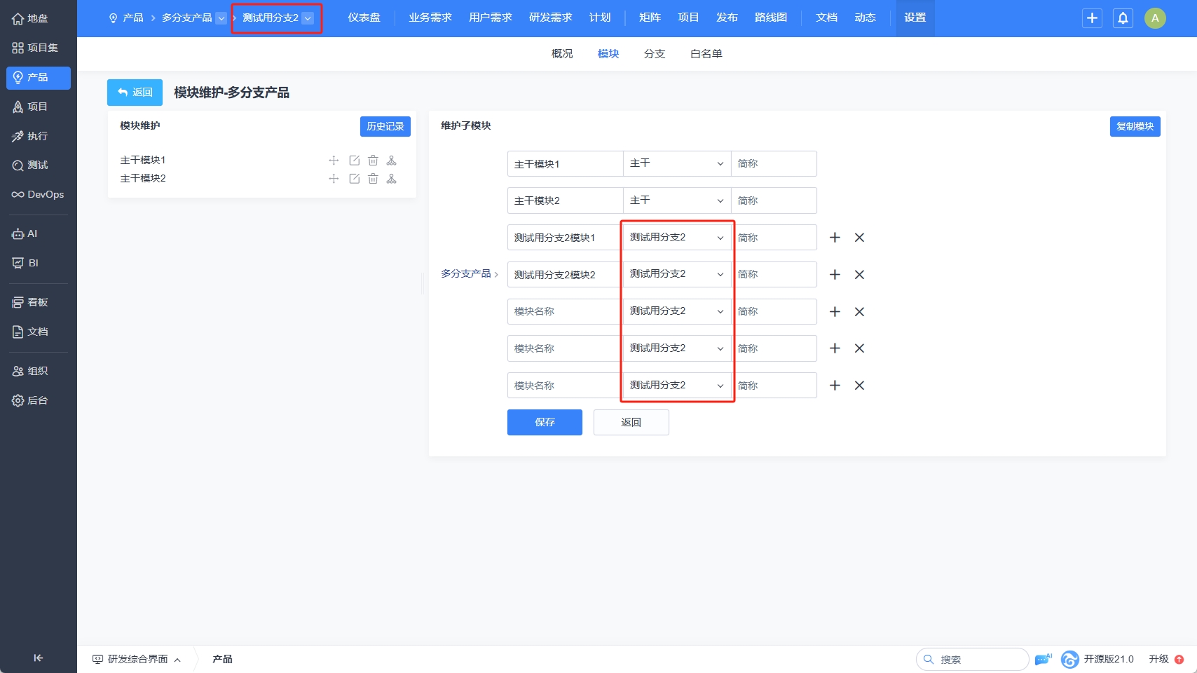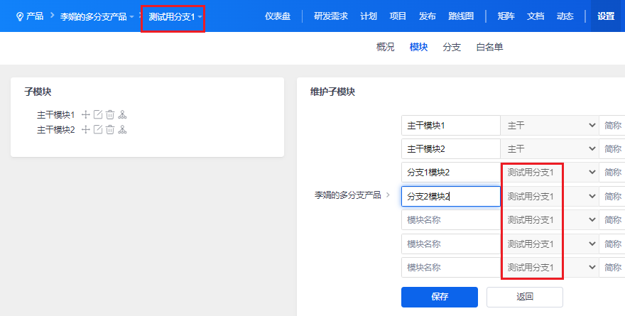 维护了分支后,接下来我们来维护分支下的模块。分支的模块维护与正常产品的模块维护一致,我们简单介绍说明一下。1、添加分支的模块