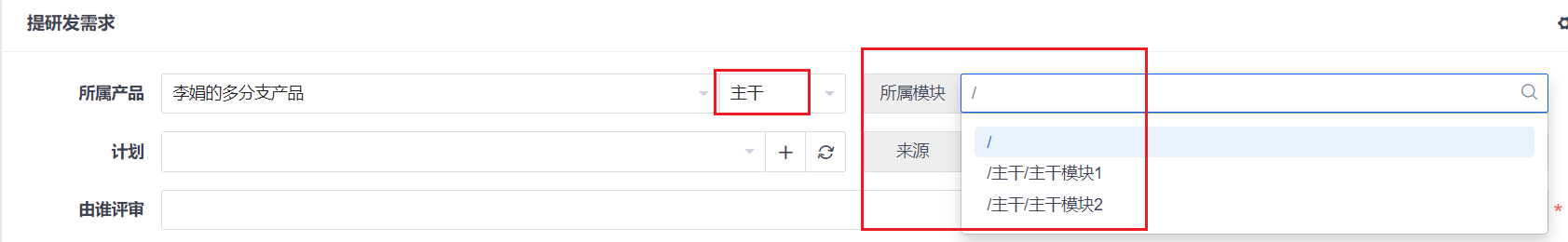 创建主干需求,只能选择主干下的模块。