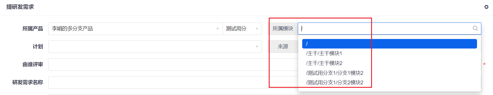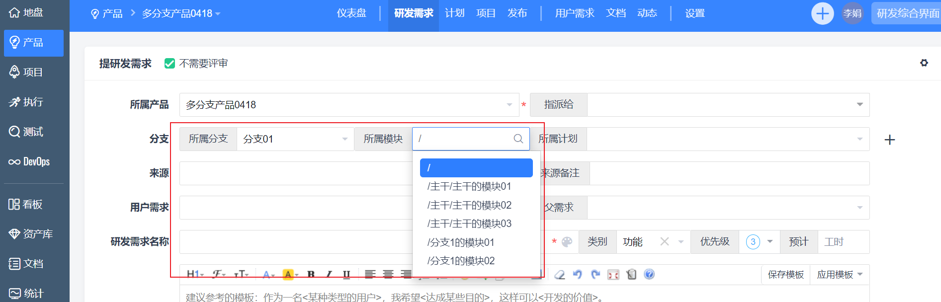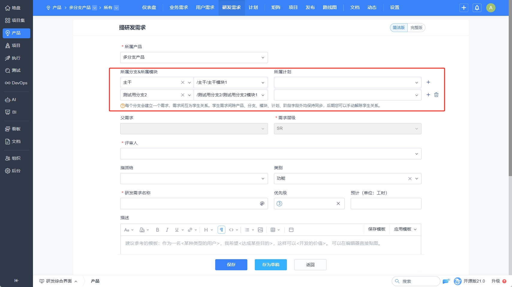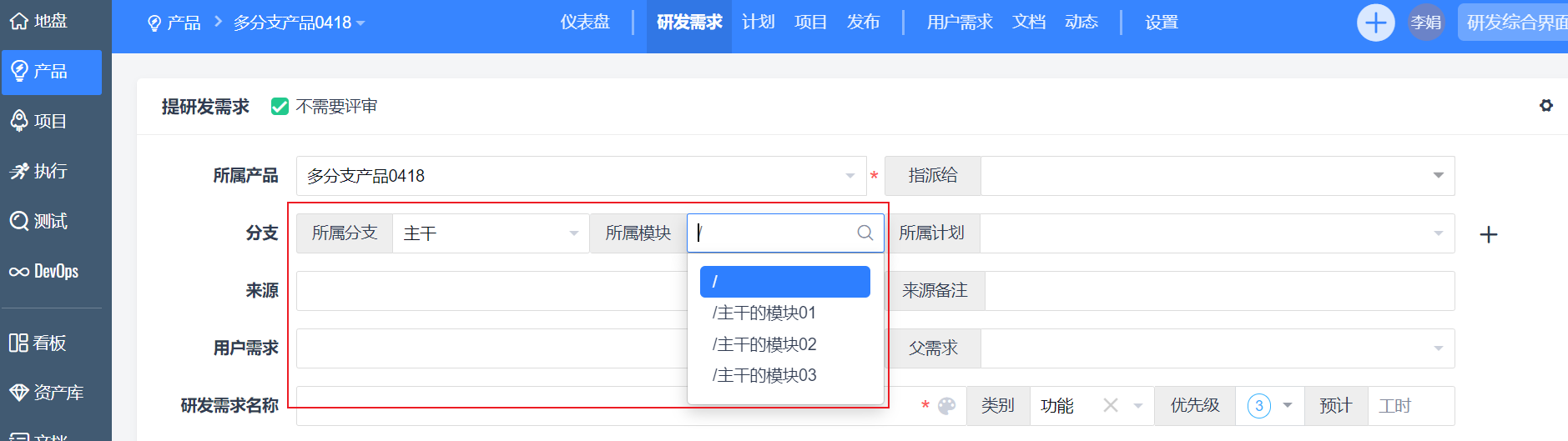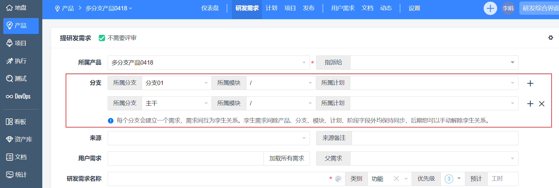 - 在多分支/平台产品中【创建研发需求】,点击【+】选择多个分支,并选择对应的模块和计划。
