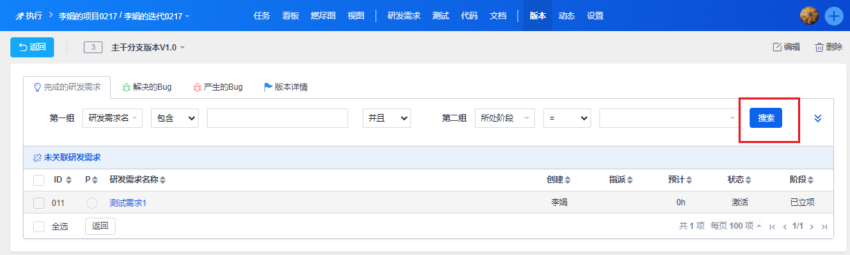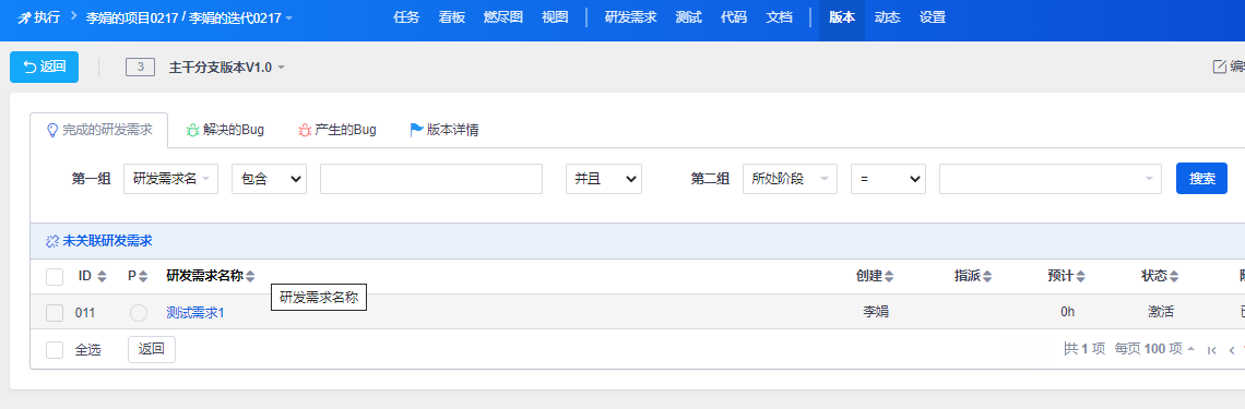 分支1版本关联需求时,不点击搜索,列表显示执行已关联主干和分支1的需求且版本未关联的需求,点击搜索时搜索主干和分支1所有的需求。