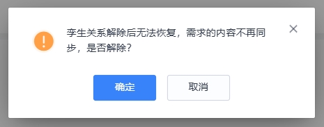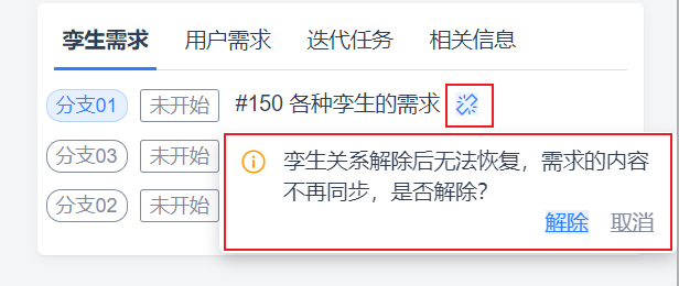 鼠标悬浮在孪生需求上,展示【解除】按钮,点击后解除此条需求孪生关系。孪生关系解除后无法恢复。