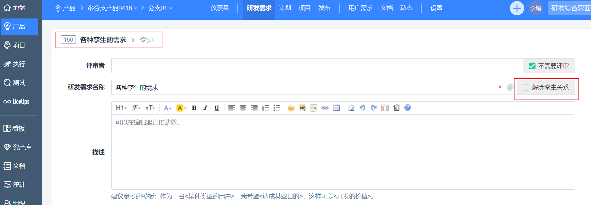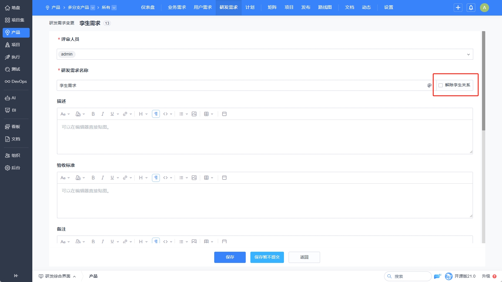 三、多分支/平台产品支持创建孪生需求