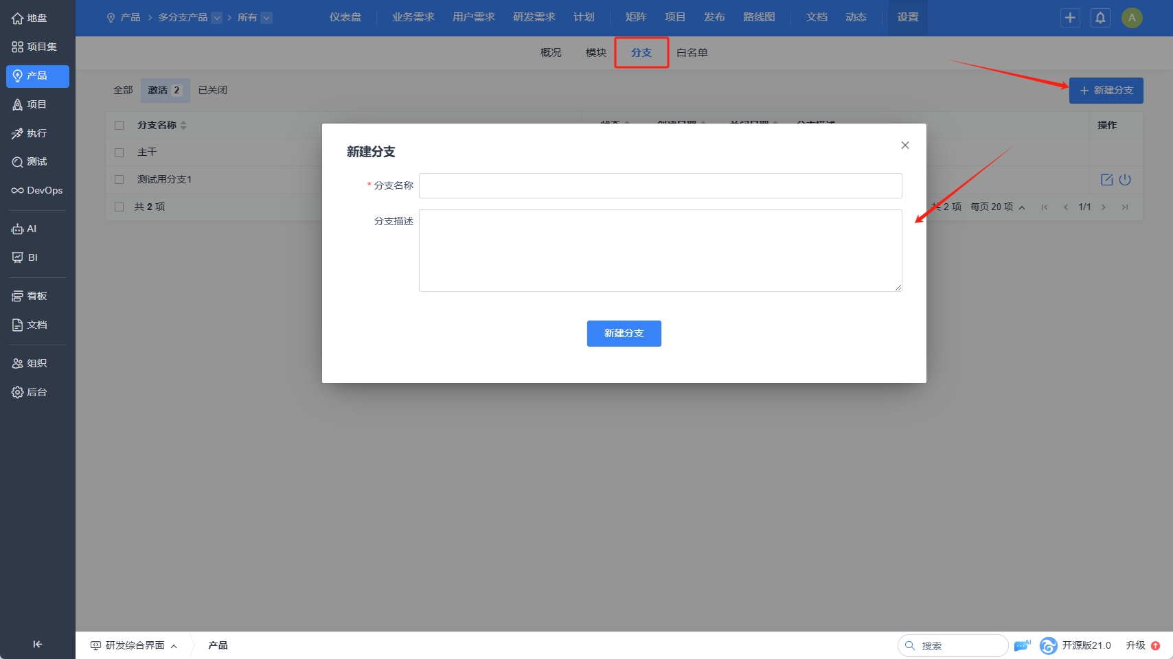 项目和执行可以关联产品的分支进行需求开发。