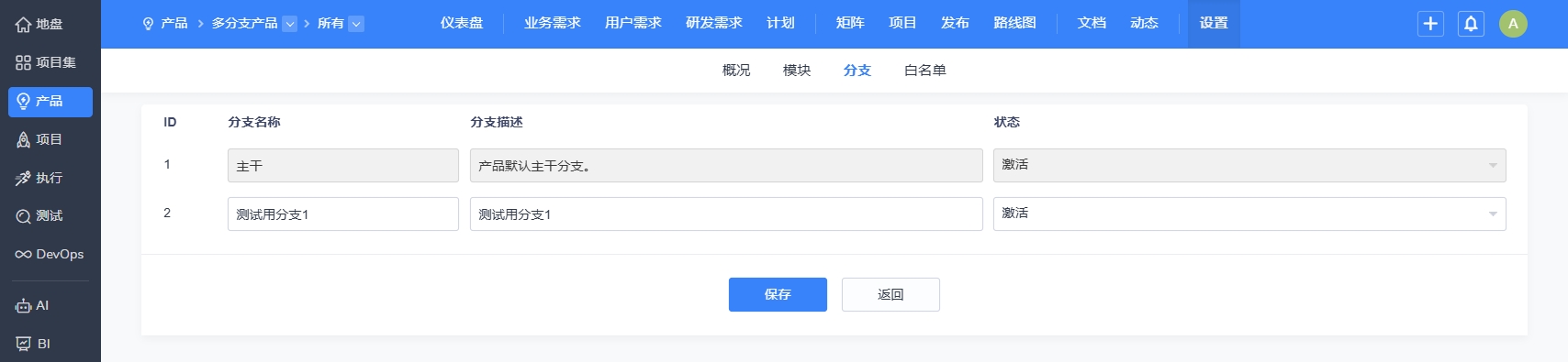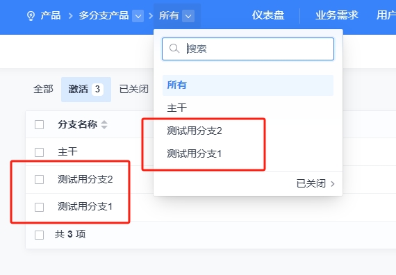 到产品--设置--分支列表里,查看和维护分支。