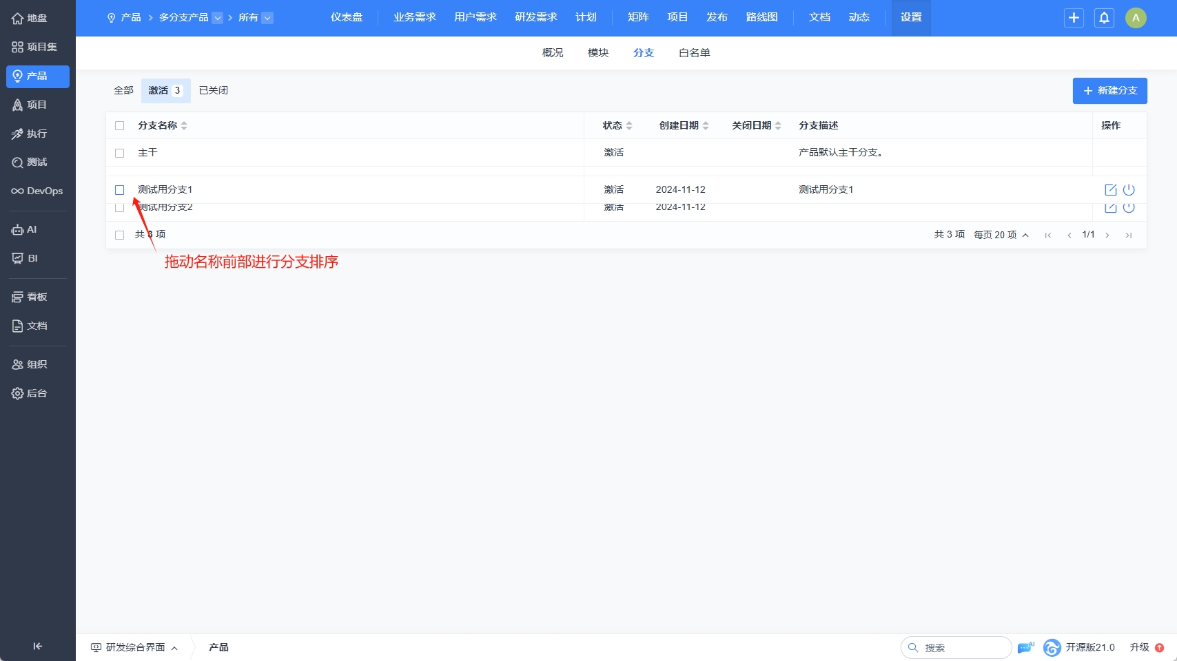 拖拽可以实现分支的排序,分支列表排序后,可以实现分支的排序。