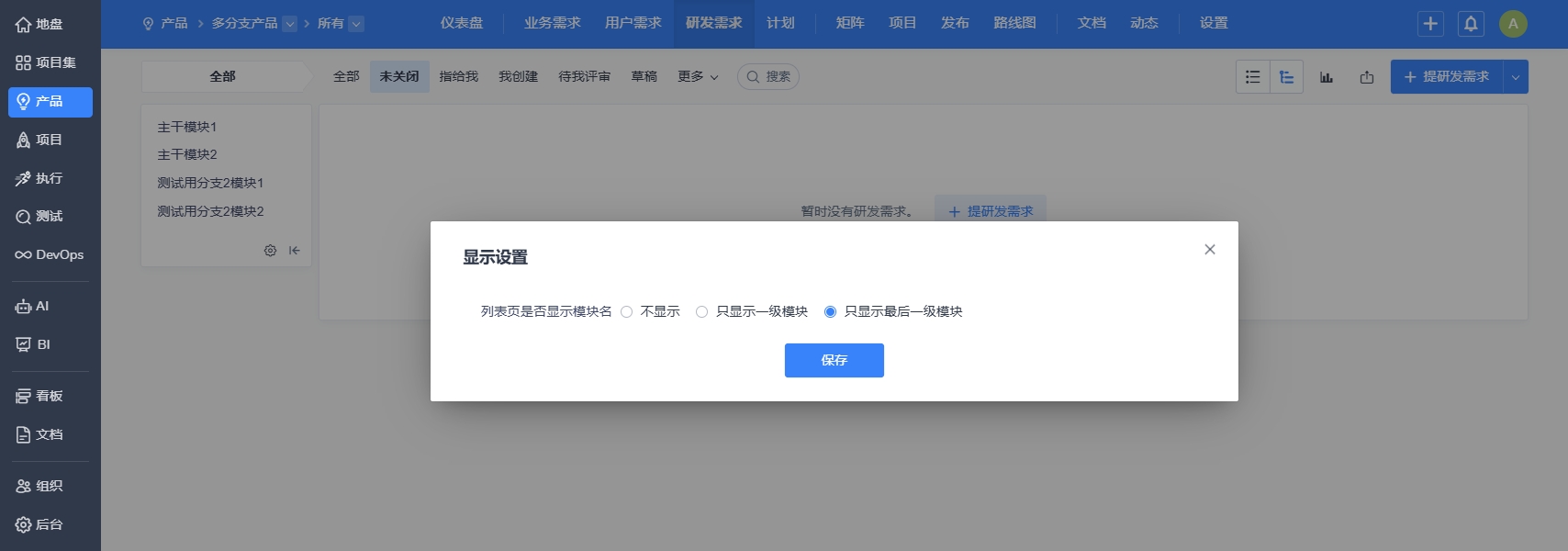 点击模块下的显示设置,可以对列表是否显示模块名和分支名进行编辑。