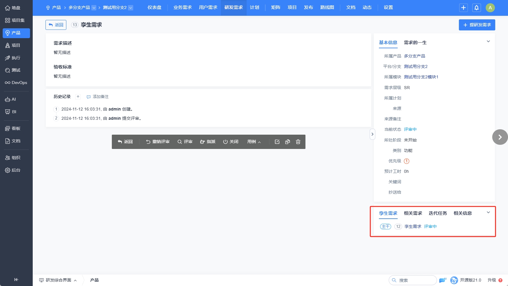 - 点击保存按钮后,每个分支会分别创建一个需求,需求间互为孪生关系。