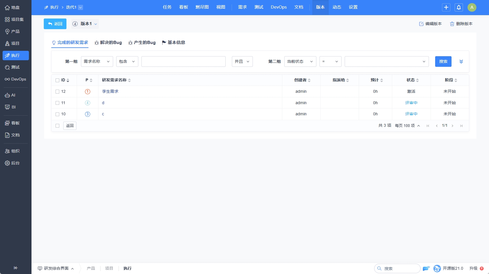 主干的版本关联需求页面,未点击搜索时,列出了执行已关联的需求且版本未关联的主干分支的需求: