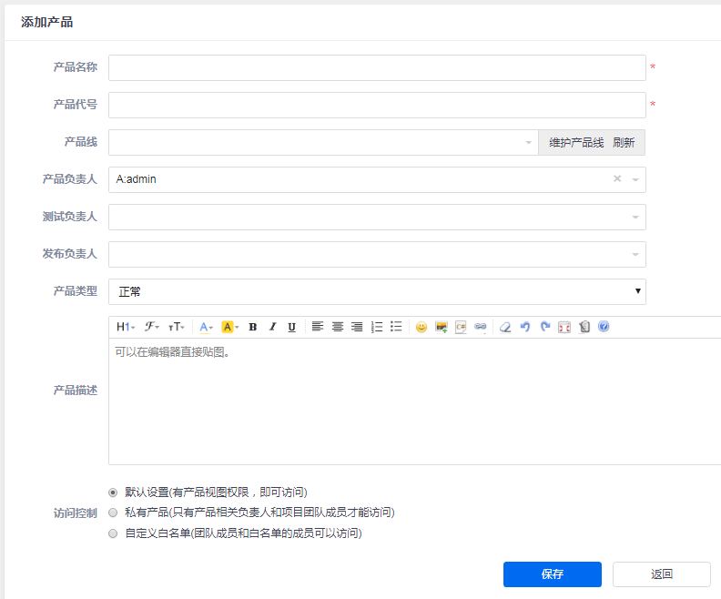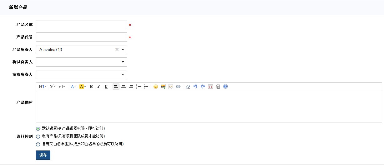 新增产品的时候,需要设置产品的名称、代号,几个负责人信息。
