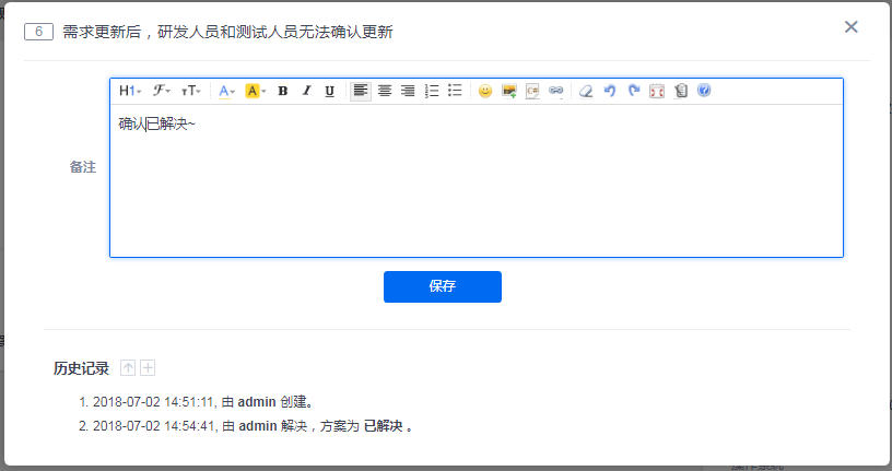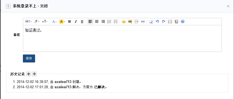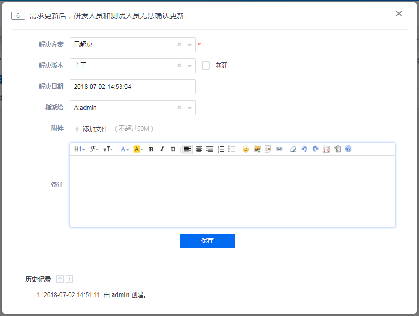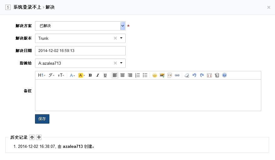 解决bug:当bug修复解决后,点击解决,指定解决方案、日期、版本,并可将其再指派给测试人员。