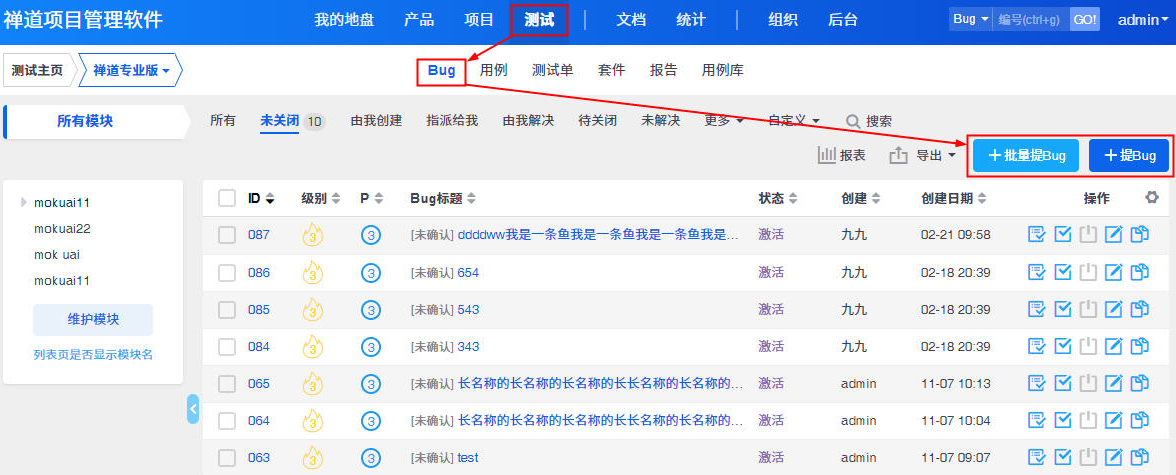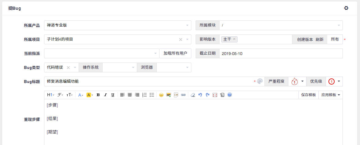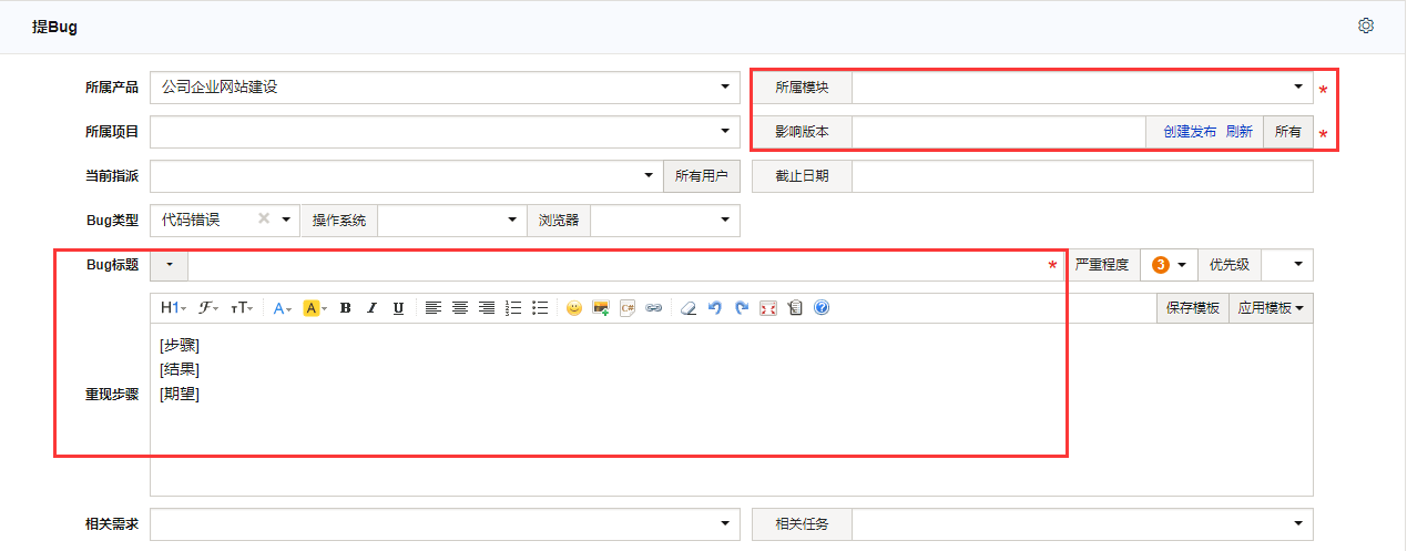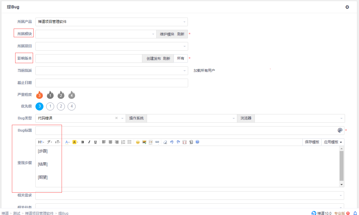 - 在创建bug的时候,必填的字段是:影响版本,bug标题,所属模块。