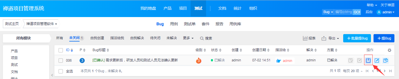 关闭bug:当研发人员解决了bug之后,bug会重新指派到bug的创建者头上。这时候测试人员可以来验证这个bug是否已经修复。如果验证通过,则可以关闭该bug。(bug列表页和详情页中都有“关闭”按钮。)