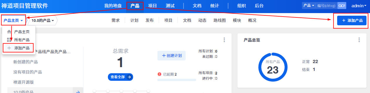 添加产品的入口有多个,可以在产品视图中的1.5级导航下拉菜单中直接点击“添加产品”。也可以在所有产品页面点击右侧的“添加产品”按钮。