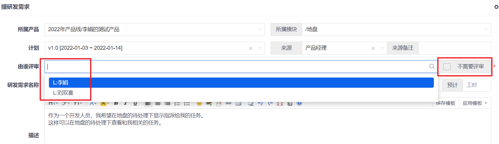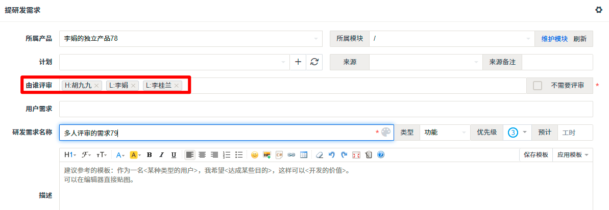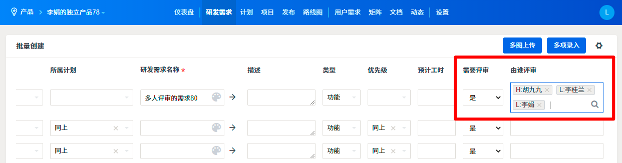 单个创建和批量创建需求时,由谁评审可以选择多人评审。