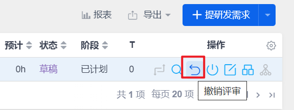 在产品--需求列表中发起评审的需求的操作栏里显示撤销按钮。