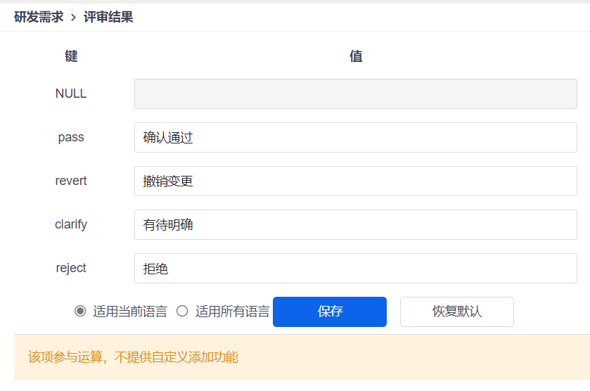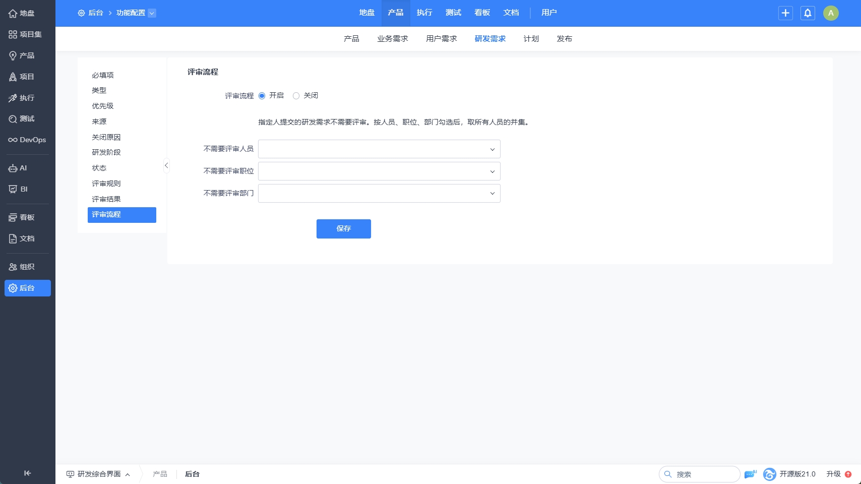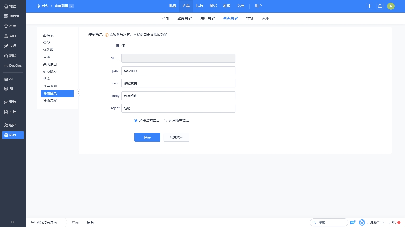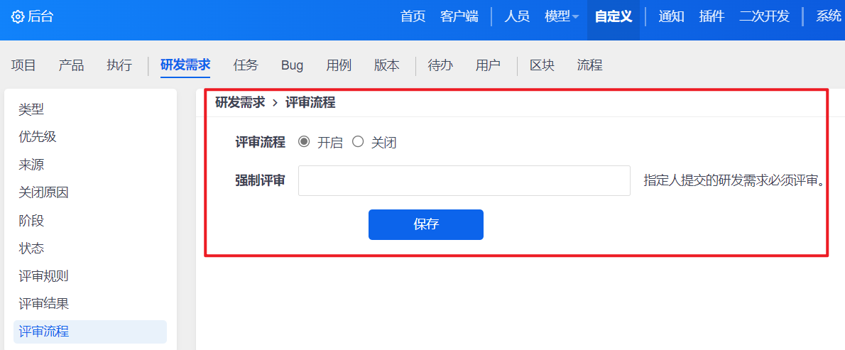 需求的评审规则、流程、结果,我们可以在后台--自定义--需求里查看和设置。