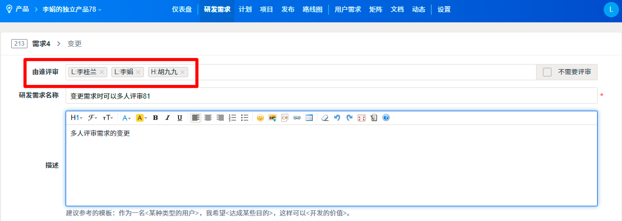 变更需求时,由谁评审也默认列出设置的评审人。