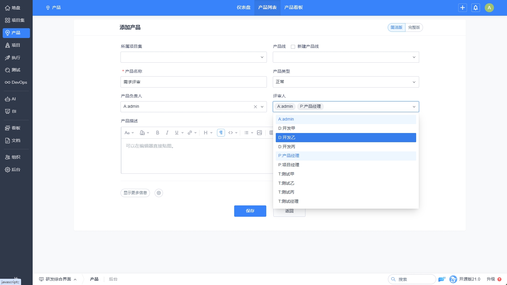 创建和编辑产品时,我们新增了产品评审人的字段。设置了产品评审人,那么在该产品下创建需求、变更需求时,需要评审时,默认的评审人就是设置的产品评审人。