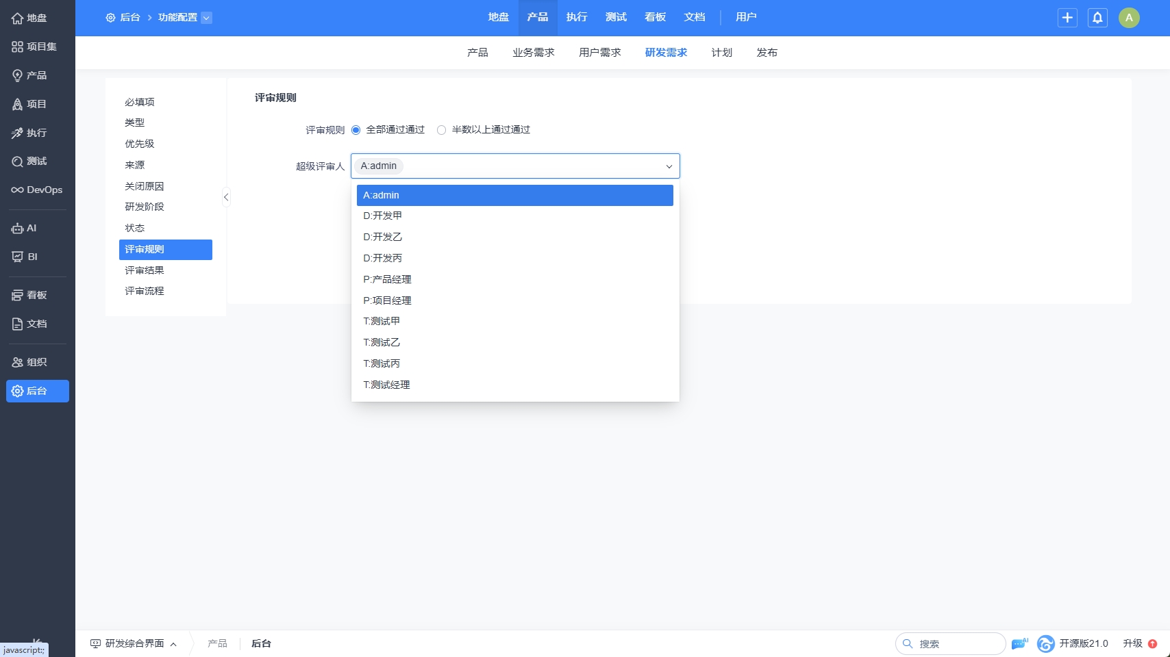 评审规则可以到后台--自定义--需求--评审规则里进行选择。
