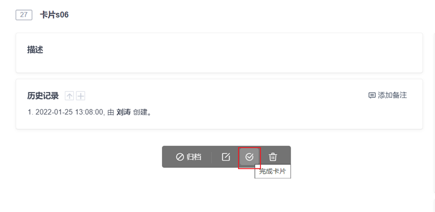 在卡片更多菜单或卡片详情页中点击“完成功能”,卡片变为完成,完成的卡片名称前会显示“已完成”标识。