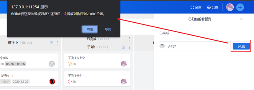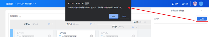 点击区域的归档功能->查看已归档子列,点击【还原】,在确认弹窗中点击【确定】,已归档的列和该列的卡片都会还原到之前的位置。