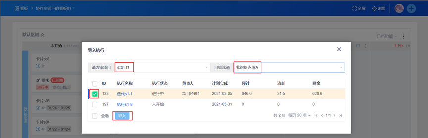 在导入执行弹窗中选择产品和目标泳道,勾选要导入的执行,点击【导入】。