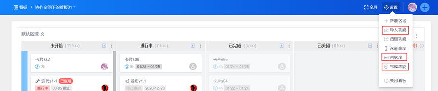 1. 看板设置功能点击设置,可以展示看板的更多设置功能: