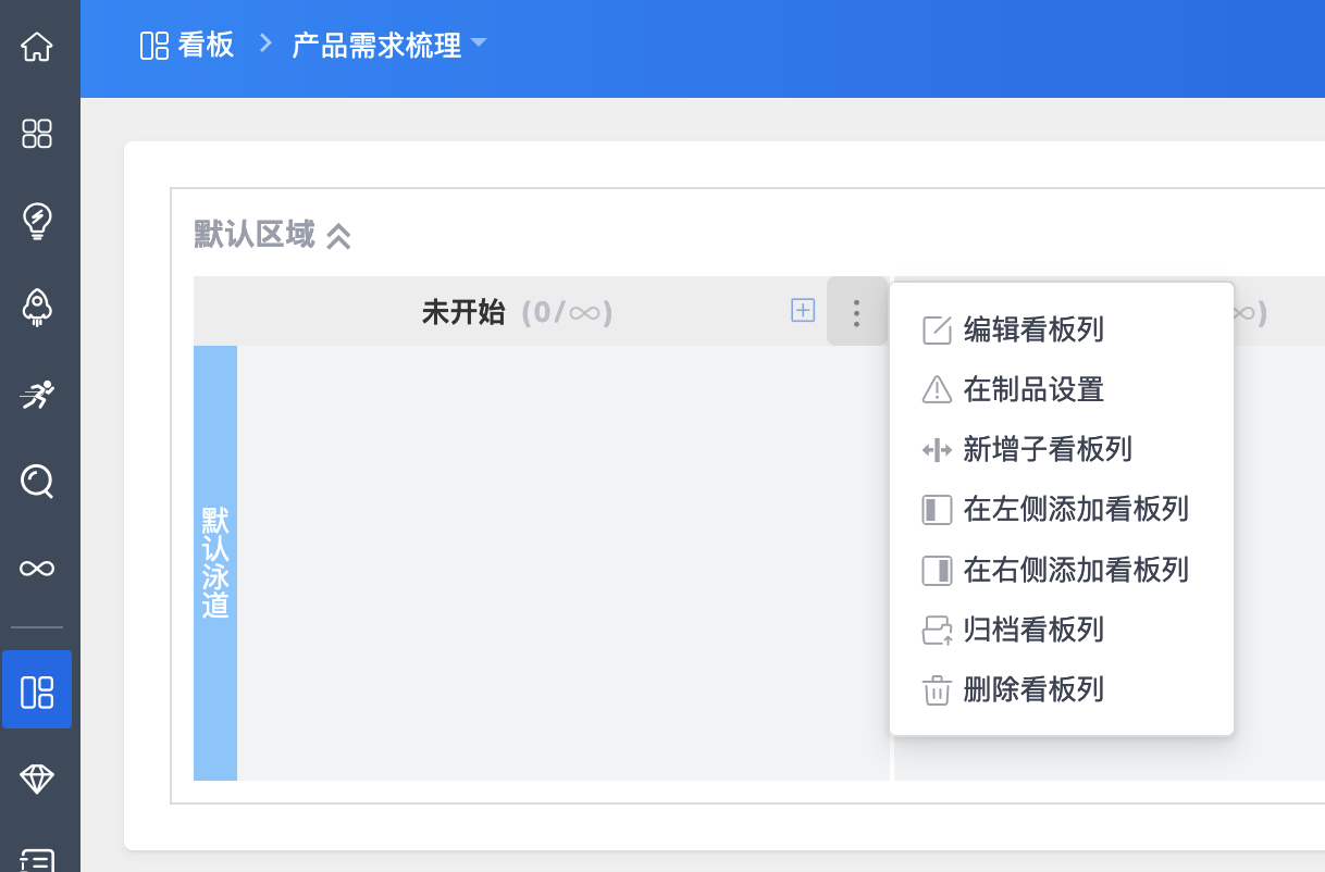 用户不仅可以调整列的名称、显示颜色,还可以设置列的在制品限制、左右新增列、拆分子列、归档列、删除列等操作。