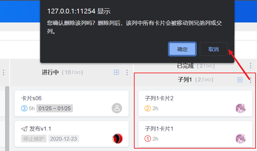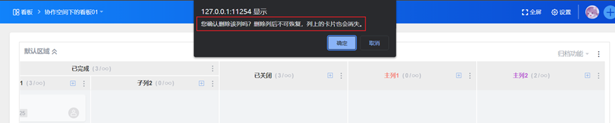 点击【确定】删除该看板列,该列中的卡片会移动到左侧的兄弟列中。点击【取消】,不删除该看板列。