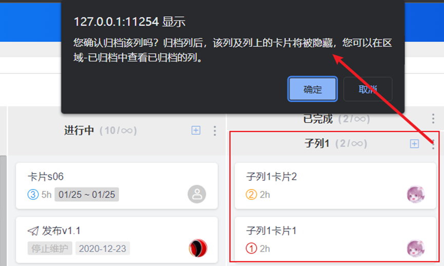 在看板子列-更多菜单下,点击【归档看板列】,会给出提示信息“您确认归档该列吗?归档列后,该列及列上的卡片将被隐藏,您可以在区域-已归档中查看已归档的列。”,点击【确定】归档该看板列,点击【取消】不归档该看板列。
