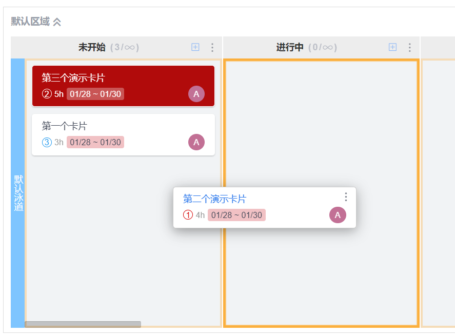 卡片拖动后,目标看板列会有橙黄色的高亮提示,释放卡片即可完成拖动,还可以在列中对卡片进行上下拖动排序。