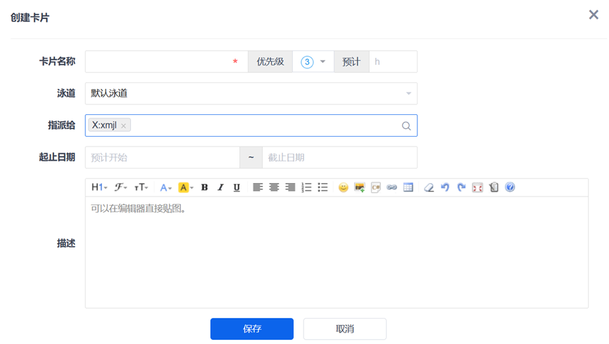 维护卡片名称、所属泳道、指派人等,点击保存就成功创建了卡片。