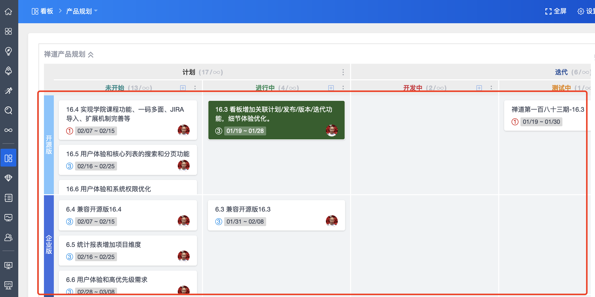 - 导入功能:看板中可以导入禅道项目中的计划、发布、执行、版本等内容,已经转入其他看板中的卡片。