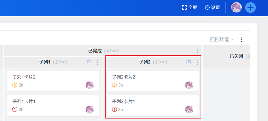 通用看板中取消了两个子列不支持归档和删除的限制,子列也可以根据需要灵活的进行归档或删除操作。