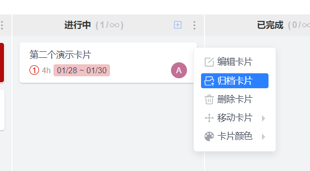 通用看板中的卡片支持完成和激活操作,不与列进行状态绑定,只是单纯的标识卡片的是否完成。
