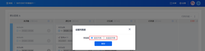 点击看板右上角的设置--列宽度,弹窗展示设置列宽页面,可以设置列宽为固定列宽或自适应列宽。