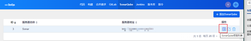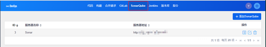 SonarQube服务器列表包括三行信息列ID,名称,服务器地址,操作按钮列包括“sonarqube项目列表按钮”、‘编辑SonarQube服务器“按钮和”删除SonarQube服务器“按钮。
